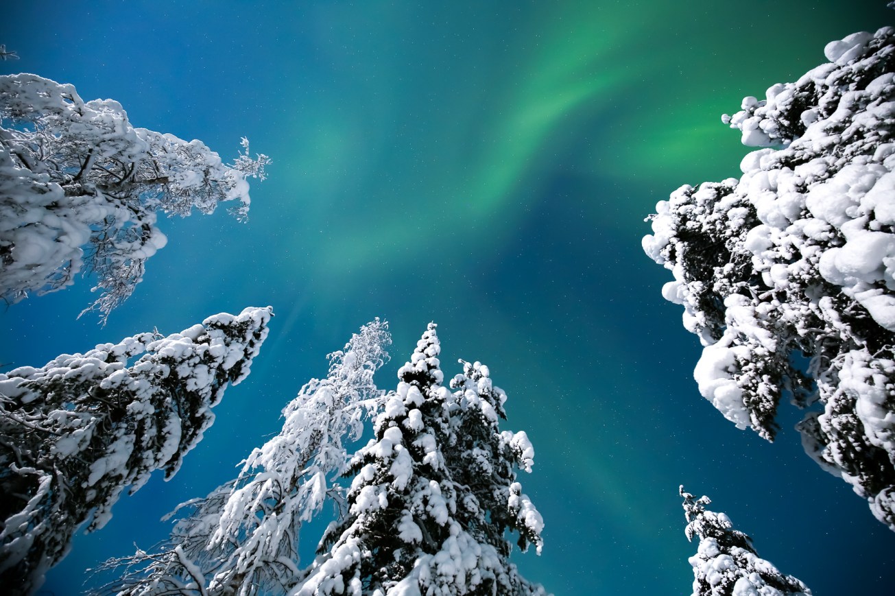 The Aurora Borealis, as seen from the woods of Ylläsjärvi, Lapland. Finnland, January 2015.